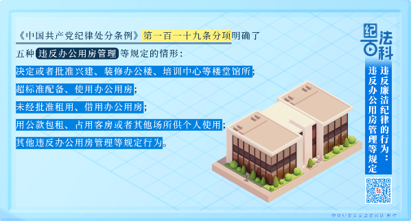 《中国共产党纪律处分条例》第一百一十九条分项明确了五种违反办公用房管理等规定的情形:决定或者批准兴建、装修办公楼、培训中心等楼堂馆所;超标准配备、使用办公用房;未经批准租用、借用办公用房;用公款包租、占用客房或者其他场所供个人使用;其他违反办公用房管理等规定行为。有上述行为之一,对直接责任者和领导责任者,情节较重的,给予警告或者严重警告处分;情节严重的,给予撤销党内职务处分。